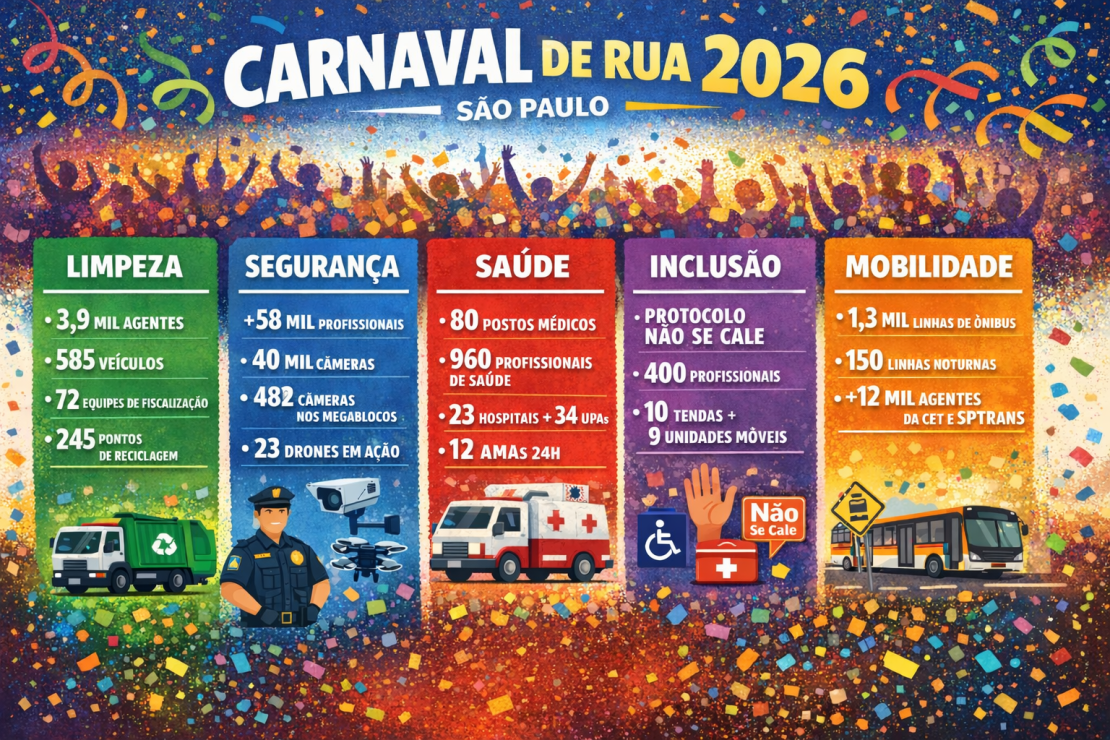 Mais de 58 mil profissionais atuarão durante os oito dias oficiais de festa, entre agentes da Guarda Civil Metropolitana, Polícia Militar e segurança privada. O monitoramento será feito com mais de 40 mil câmeras do sistema Smart Sampa, incluindo 482 câmeras instaladas nos megablocos, além do uso de drones, viaturas e equipes à paisana. A Prefeitura também intensifica as ações de prevenção ao assédio, com agentes descaracterizados e equipes especializadas em áreas de grande circulação.